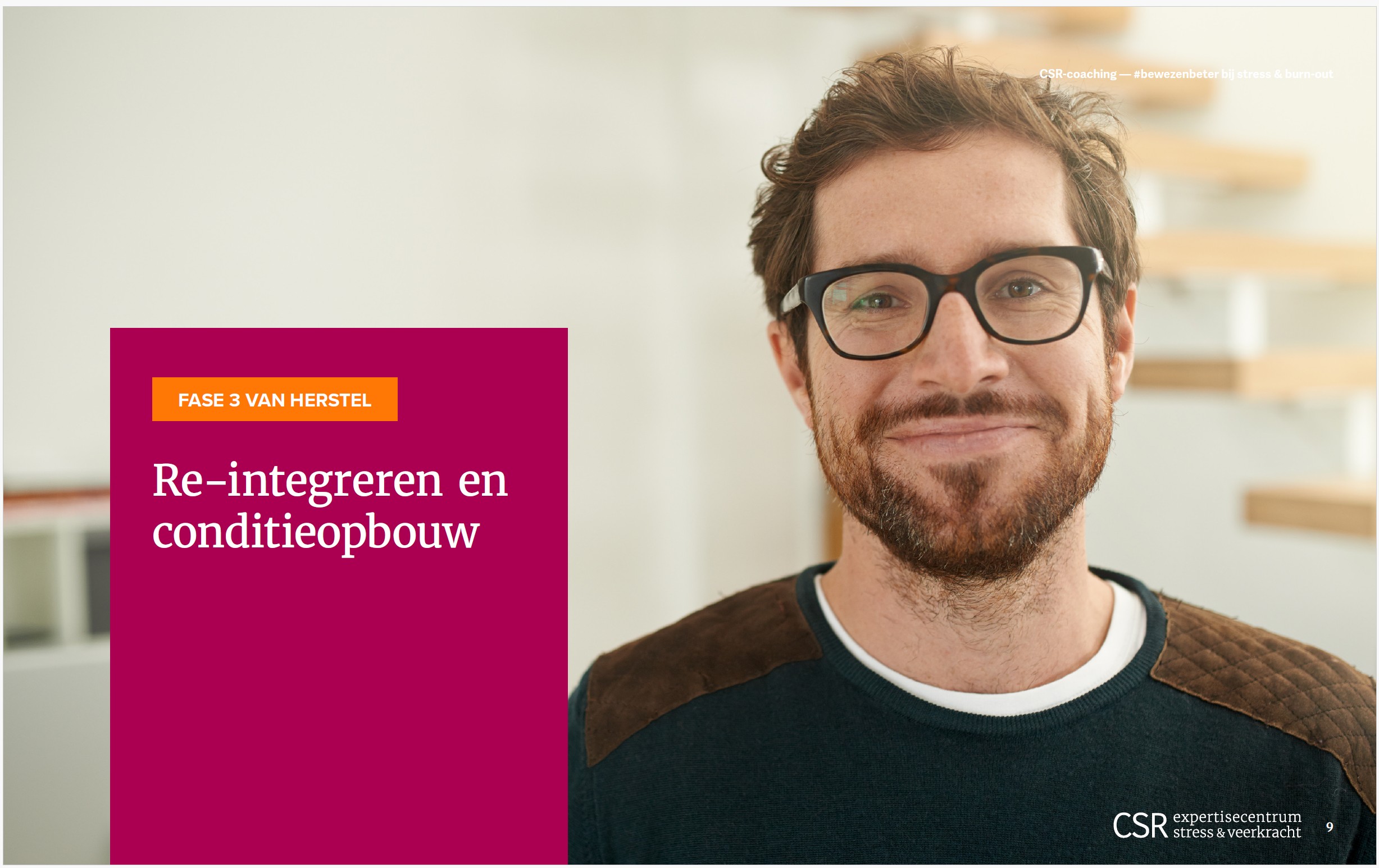 Het herstelproces van een burn-out is een langdurig traject. Gemiddeld duurt het ongeveer een jaar voordat de klachten zo ver afnemen dat mensen hun taken weer kunnen oppakken. Daarbij richt de CSR-methode zich op: